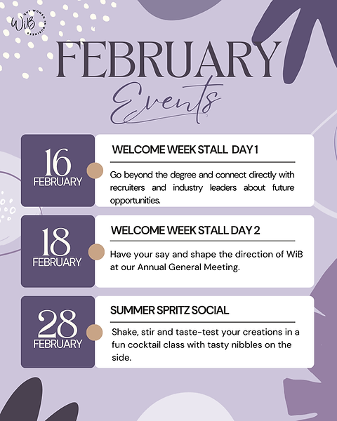 WiB hosts a number of Industry, Workshop, Volunteering and Social events for our members during Semesters 1 and 2.